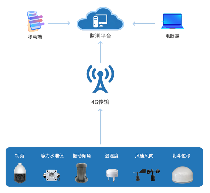 为全面提升通信塔基础设施的安全运维水平,构建科学化、精细化、数字化的安全保障体系,特建立通讯塔安全监测系统。该系统以物联网感知技术为核心,旨在实现对铁塔结构健康状态的全天候、多维度实时监测,形成"感知-分析-预警-处置"的全链条闭环管理。通过部署高精度倾角振动传感器、应变计、三维加速度计、GNSS位移监测站等智能终端,结合气象环境监测设备,系统可实时采集倾斜度、应力变化、位移沉降等关键参数,构建铁塔数字孪生体,精准掌握结构动态特性。